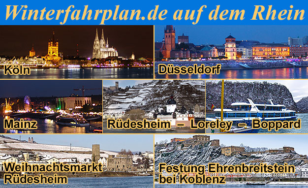 Weihnachtsmärkte in Deutschland Köln, Rhein Koblenz, Rhein Trier, Mosel Oberwesel, Rhein Mainz, Rhein Frankfurt, Main Heidelberg, Neckar Christkindlesmarkt NürnbergReiterlesmarkt Rothenburg o. d. Tauber Feuchtwangen Regensburg, Donau Striezelmarkt Dresden, ElbeWeserbergland, Minden, Hameln, Höxter Einbeck Berlin, SpreeWinterfahrplan auf dem Rhein mit Winterschifffahrten der Rheinschifffahrt zwischen Düsseldorf und Mainz: ![]() Willkommen bei Winterschifffahrt.de – Ihr Tor zur winterlichen Rheinromantik ! Weitere Weihnachtsmärkte 2025 2026 in Deutschland Weihnachtsmarkt |